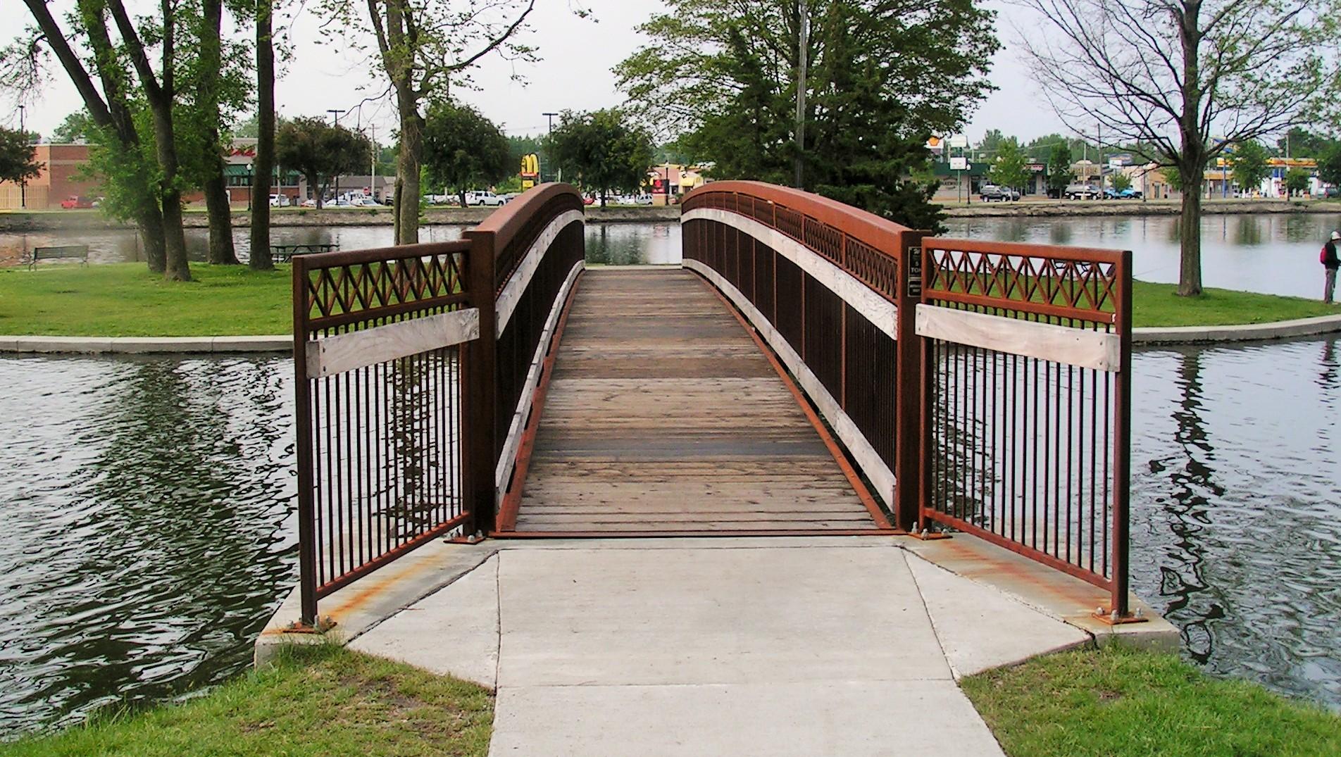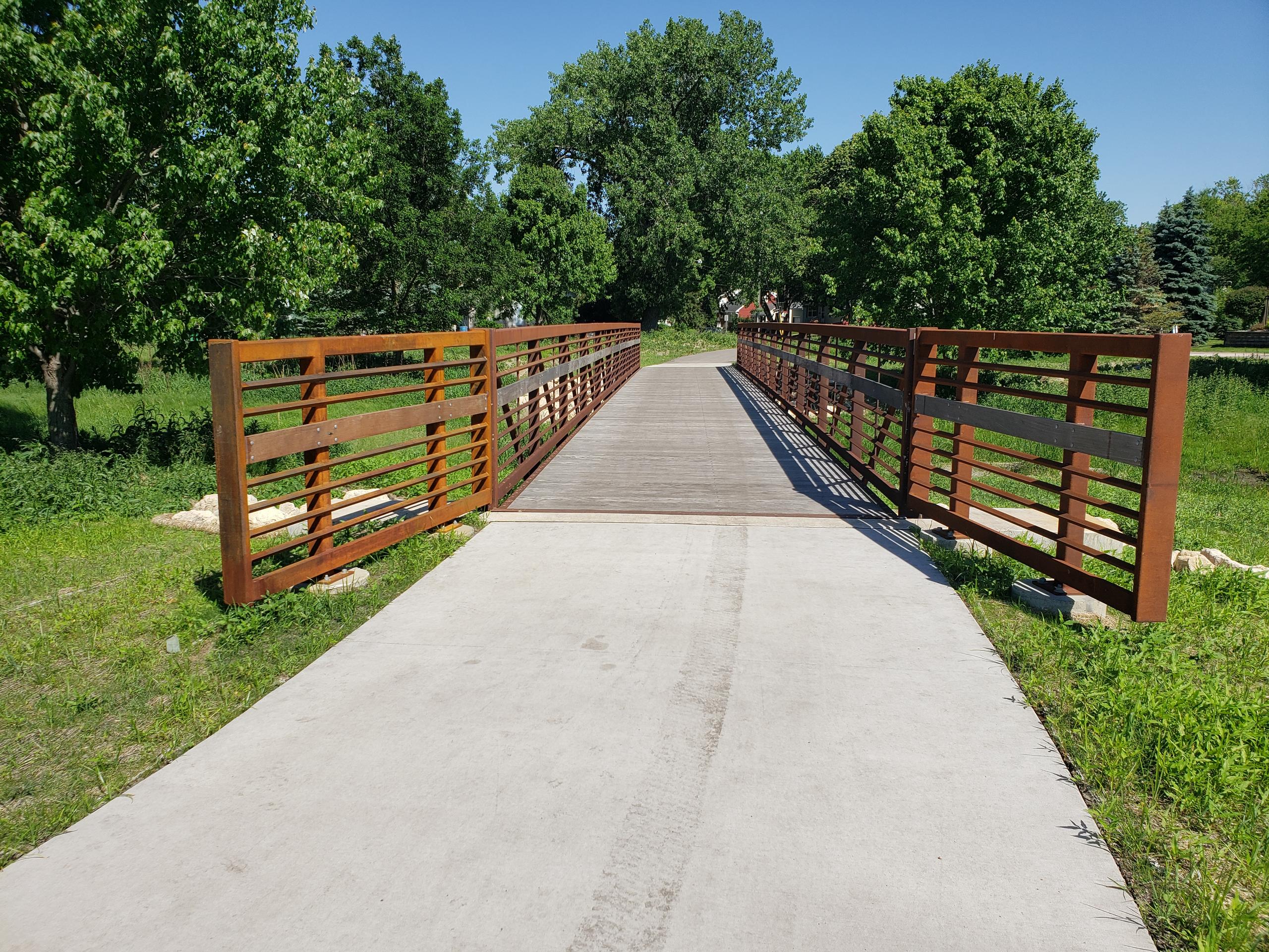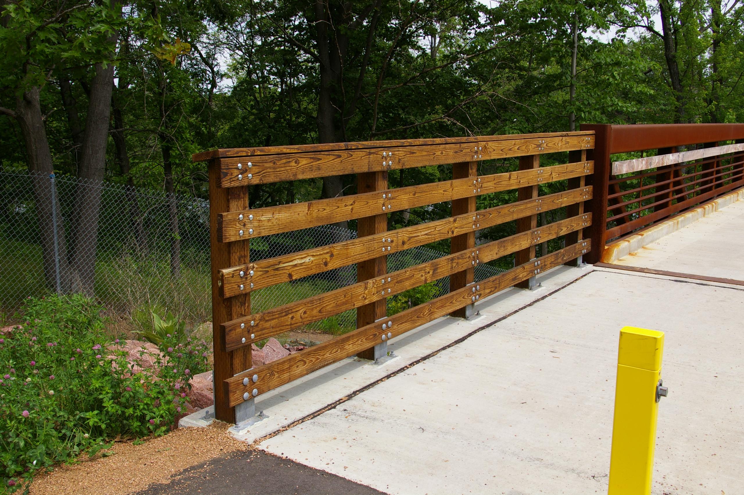Approach railing guides users onto the bridge. Custom sections can be built to match or complement the bridge. Less expensive options utilize preserved wood. Regardless of style, approach railing is encouraged.